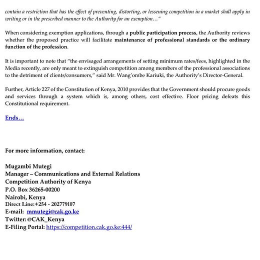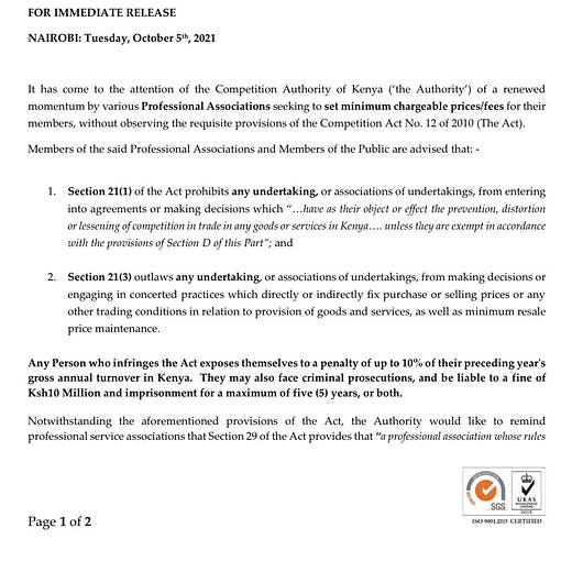Recently, the Competition Authority of Kenya (CAK) issued a public notice to professional associations who are seeking to set minimum chargeable fees for their members. So, imagine if the Nigerian Bar Association prescribed minimum fees that Nigerian lawyers can charge their clients. And the notice reminded the associations of their obligation to comply with the provisions of the Kenyan Competition Act.